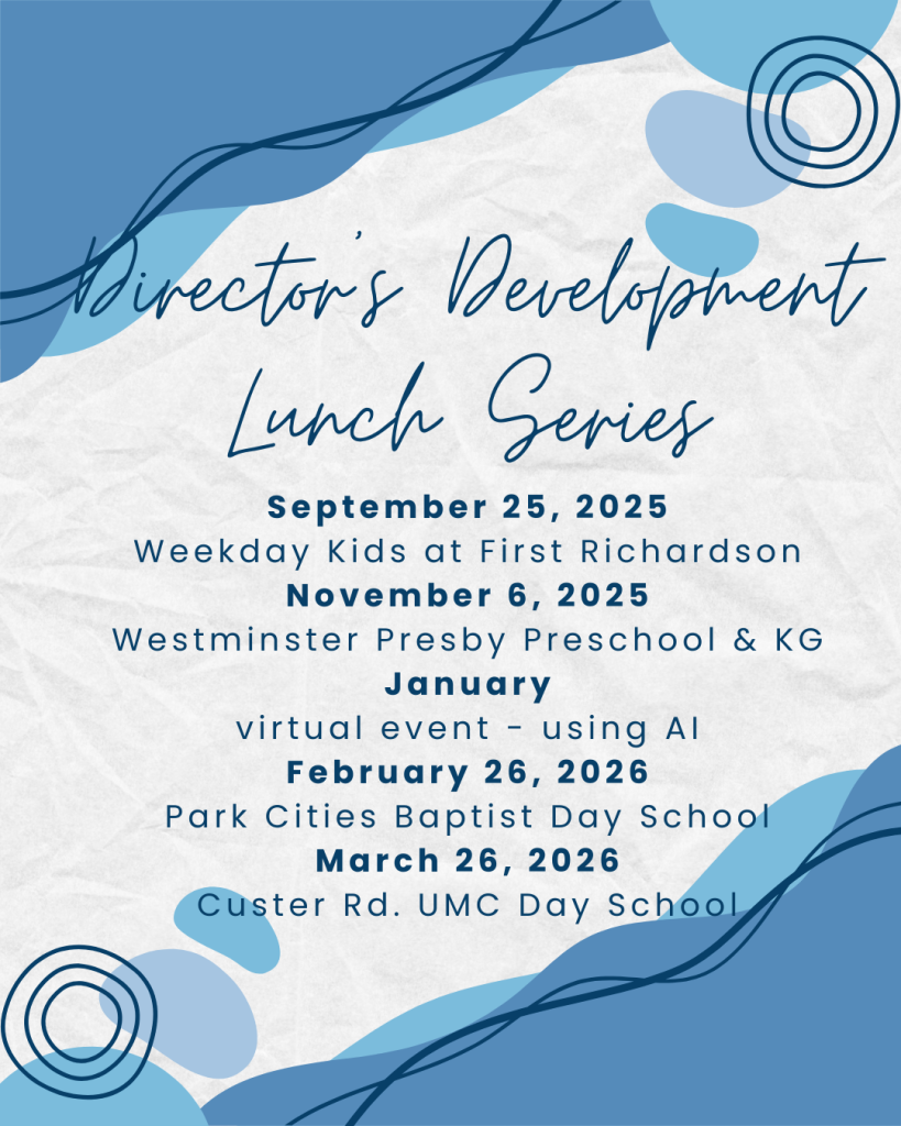 Each year Dallas ECCE offers its members five Directors’ Roundtable meetings (no fee) and a summer workshop for directors (fee) in addition to an elite group of childcare administrators with hundreds of years of experience and a common mission. Dallas ECCE members receive a discount on the participation fee for workshops that have a charge. In addition to being eligible for the workshops, member schools each receive a membership directory in the fall, which aids in networking with other professionals in similar programs.