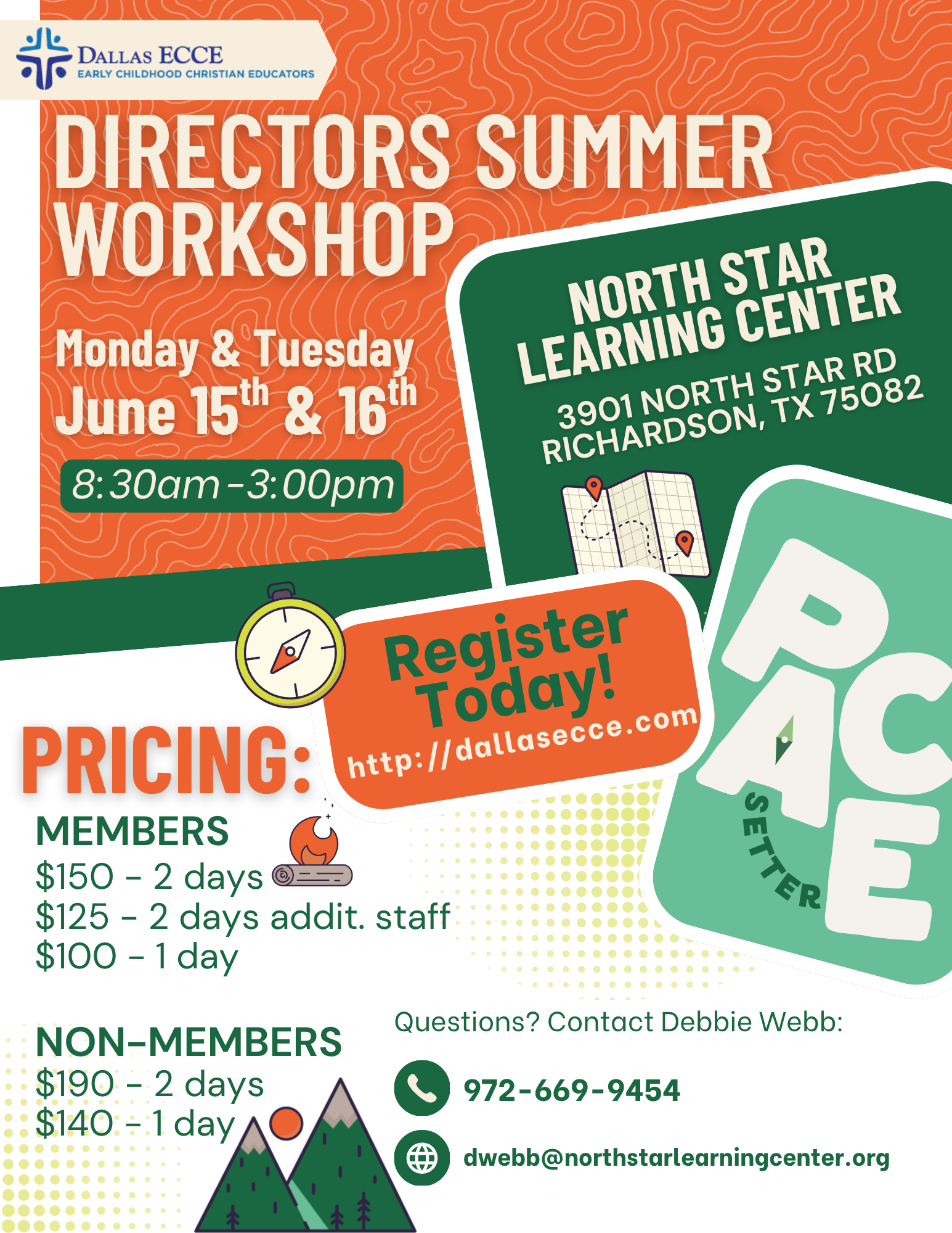 Each year Dallas ECCE offers its members five Directors’ Roundtable meetings (no fee) and a summer workshop for directors (fee) in addition to an elite group of childcare administrators with hundreds of years of experience and a common mission. Dallas ECCE members receive a discount on the participation fee for workshops that have a charge. In addition to being eligible for the workshops, member schools each receive a membership directory in the fall, which aids in networking with other professionals in similar programs.